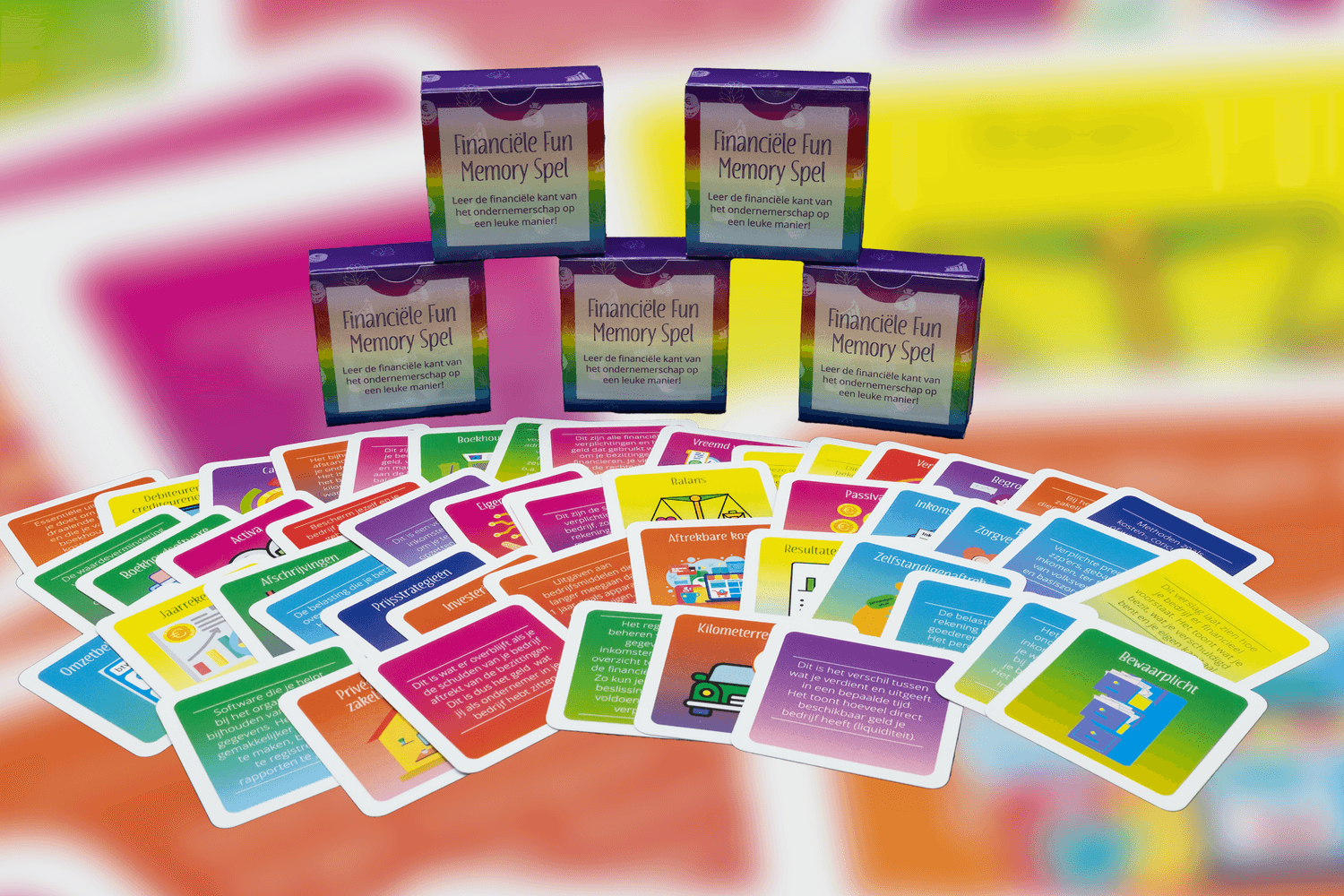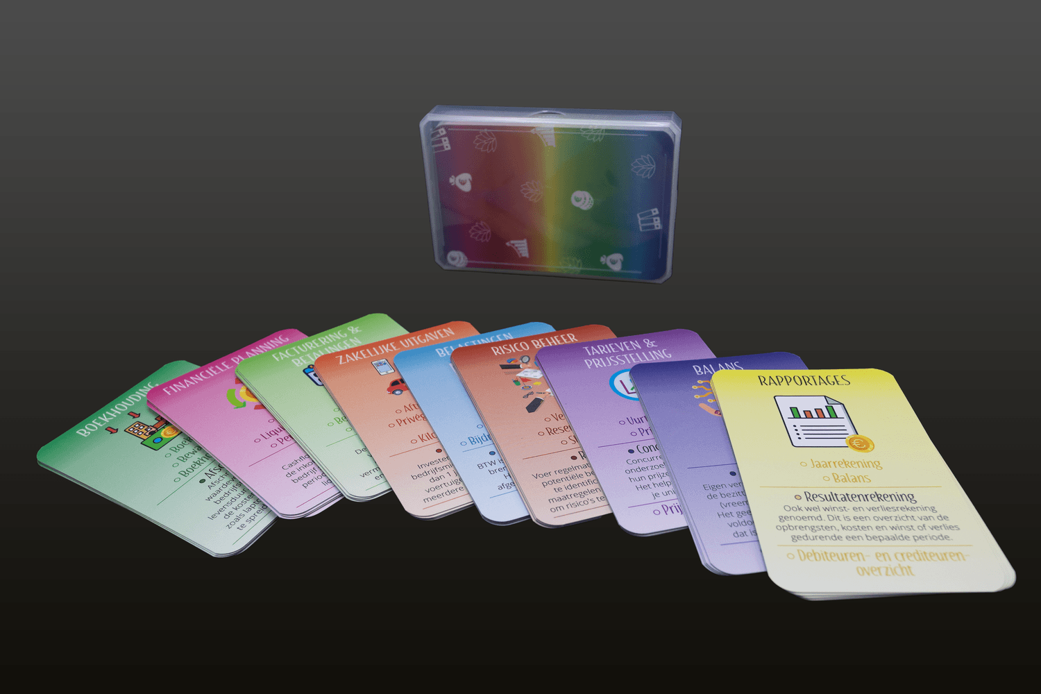 Een kaartspel dat de financiële kant van het ondernemen op een unieke en speelse wijze benadert. Het Financiële Fun Kwartet bestaat uit 9 hoofdthema's, elk met hun eigen kleur en 4 subthema's met een plaatje en een uitlegtekst. Dit kaartspel is ontworpen om jou, als enthousiaste ondernemer, te helpen grip te krijgen op je financiën en je zakelijke succes te vergroten.